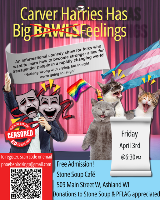 Admission is free, but donations to Stone Soup and PFLAG are appreciated.